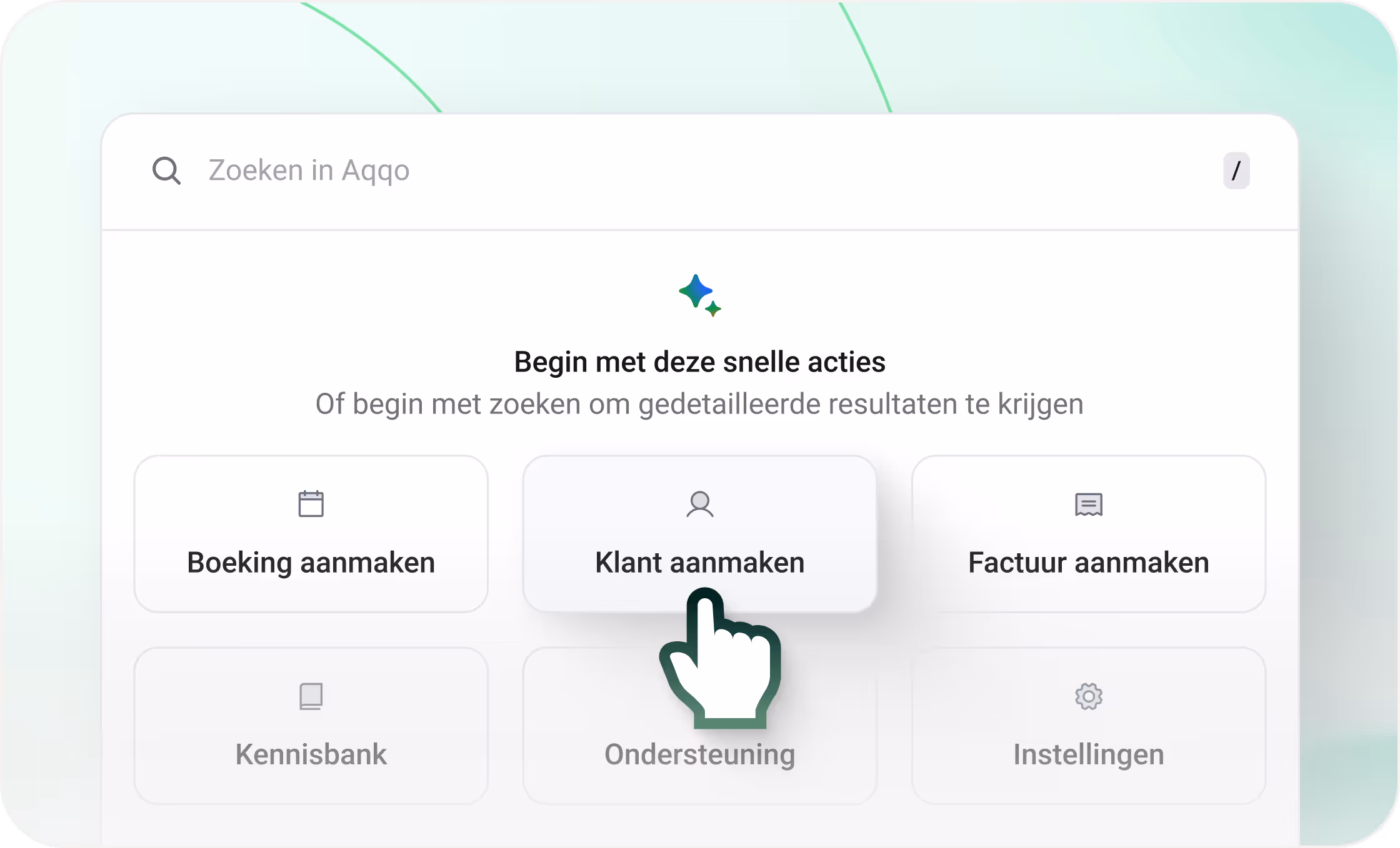 Vanaf maandag 24 november is de nieuwe, slimme zoekbalk beschikbaar. Met deze zoekfunctie doorzoek je realtime de belangrijkste onderdelen van je Aqqo-omgeving. Wil je snel een klant opzoeken, een boeking openen of een factuur controleren? Je vindt het in een paar seconden. Je hoeft minder te klikken, hebt minder tabbladen nodig en vindt informatie sneller en overzichtelijker.